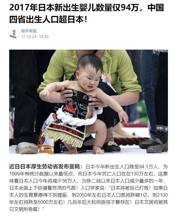 2017年,整个日本一共只有94万新生人口,还没有一个小网红的粉丝多。要知道我们虽然说日本小,但日本也是一个拥有超过1亿人口的国家,出生率还不到0.94%。