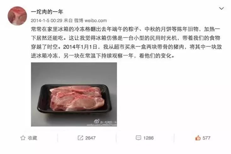 这位博主突发奇想买了两块肉,观察放冰箱和不放冰箱一年后会有什么差别。