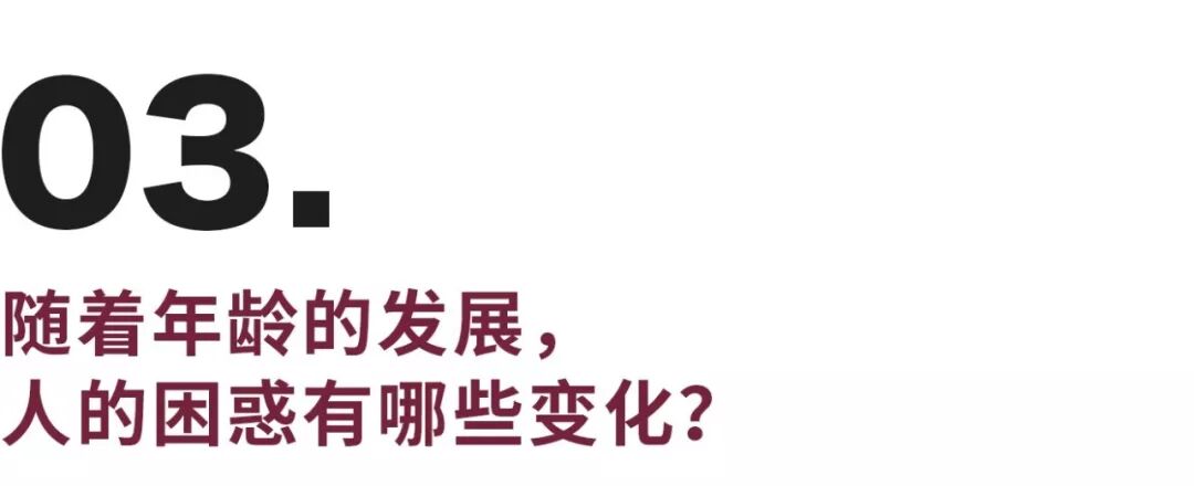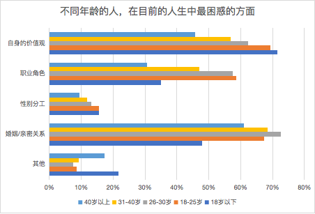 相比而言,婚姻/亲密关系,好像不是一件随着年龄变大就会解决的事。事实上,从40岁以上人群的反馈结果中我们可以发现,到那时,人们对于职业角色、自身价值观都相对不再困惑,婚姻/亲密关系反而成为了最令他们困惑的事。