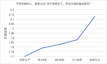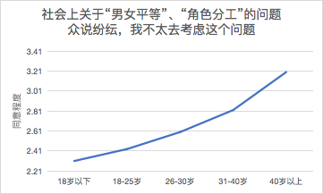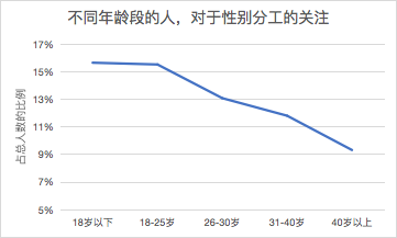 新一代人对于性别分工更具反思性,大多数人认为应该自己思考性别分工问题。我们看到,越年轻的人,越表示自己关注性别分工问题,越不认同仅仅是接纳上一代人的观点。年龄越大的人,越觉得没必要思考性别问题。