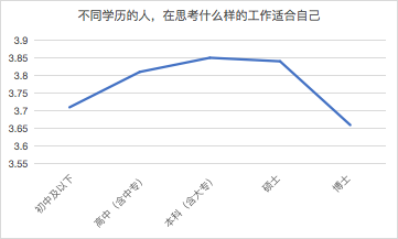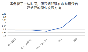 同处在“成年初显期”,但不同学历的人,在和职业相关的题目中展现出了非常有趣的两条相互呼应的折现。本科生思考自己职业方向的程度最高,硕士次之,高中生的思考也不少,到了博士学历则职业思考的程度显著下降。
