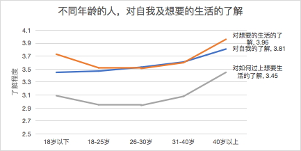 从年龄的角度看,我们得到一个有趣的结论。18岁以下的人,认为自己对于想要生活的了解程度,比18-25,26-30甚至是31-40岁的人还高。这有可能是因为年轻时,我们对于现实的了解有限、过于简化现实,而随着认知更多考虑也会更复杂起来。这样来看也许人越活越迷茫,是一种常态。