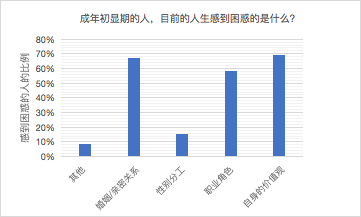 成年初显期的人,感到最为困惑的两件事是:自身的价值观,以及婚姻/亲密关系(两项都有接近70%的成年初显期用户选择)。如果你身处这个年龄段,而觉得自己已经对上述某项有了较为清晰的认知,恭喜你,你已经是人群中领先的30%。