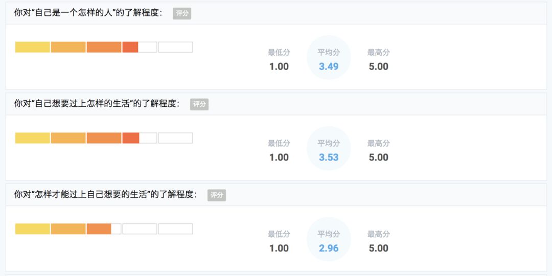 在问卷一开始的自评题目中,人们普遍认为自己对于“自己是个什么样的人”,“自己想过上怎样的生活”是有所认知的(平均分3.49、3.53,满分5分)。