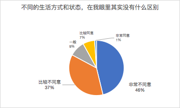 人们普遍非常关注不同的生活方式和状态,超过83%的人,不同意“不同的生活方式和状态间没有差别”。