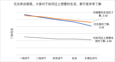 但对于“如何过上自己想要的生活”,大家感到更多的迷茫,平均分只有2.96分(4分、5分代表比较清楚和很清楚,3分代表一般/不好说)。