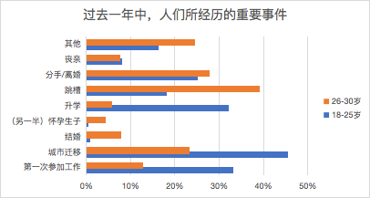 我们首先统计了一下,18-25岁,以及26-30岁的人,他们的生活中正在经历什么。我们可以看到,分手、升学、第一次参加工作,是18-25岁人群中频繁出现的重大转折性事件,在26-30岁的人群中,则还会频繁看到跳槽和城市迁移。